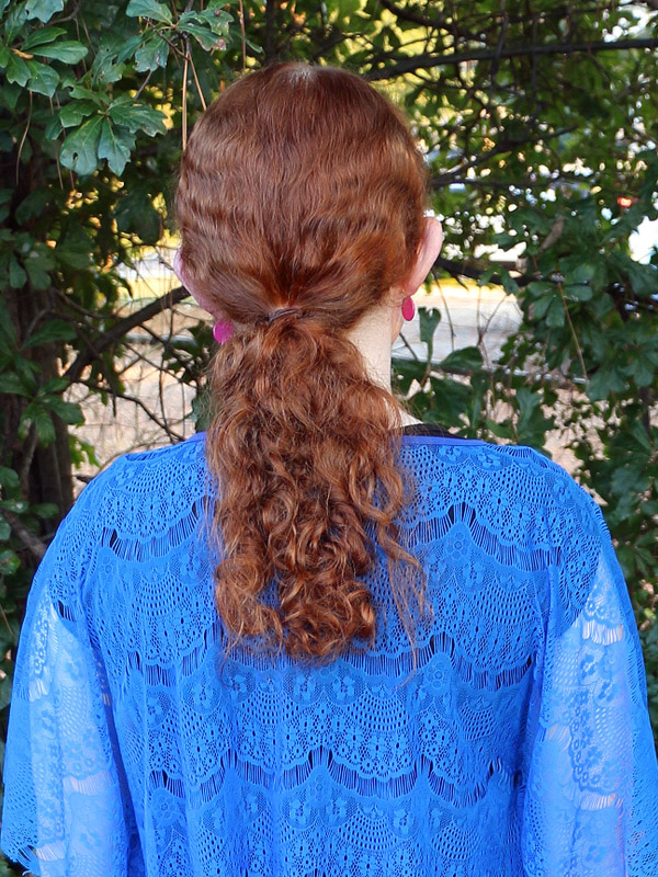 I'm trying something a little different with my hair today. I would like for it to be straighter and less volumous. What I've discovered recently is that most of the volume actually derives from brushing, combing, and otherwise detangling it after it is dry. If I leave it alone except when it is wet, the curls are much tighter, but the volume of my ponytail is less than a third of what it would normally be. Lynn loves the curlier look without reservation, though I have to fight to keep her from running her fingers through it and making it puff up. It is still far from the look I want. It also has the definite downside of preserving much of the shape of my ponytail even if the band is removed.