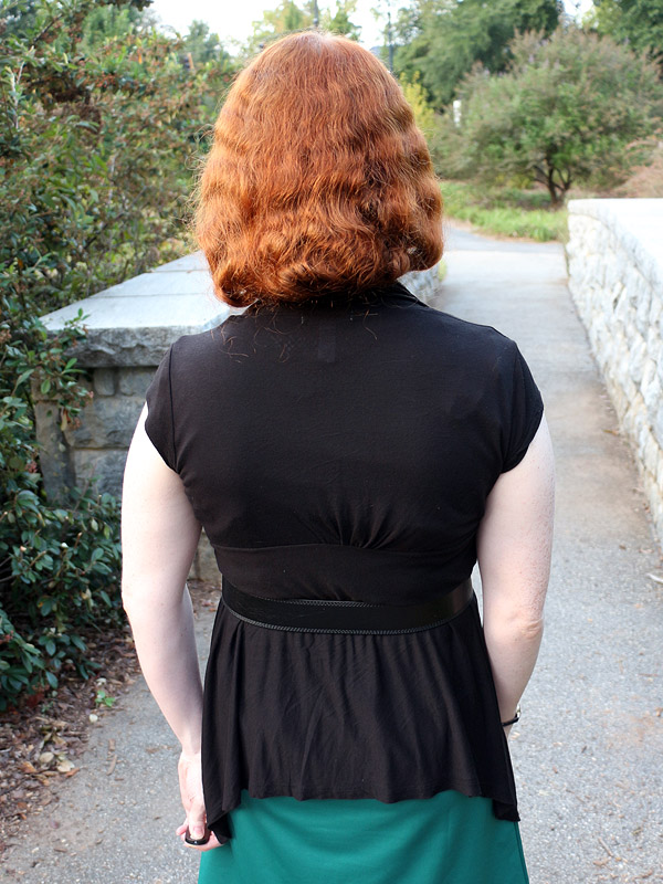 I didn't want to wear a ponytail again today, but I also didn't want to comb through and thereby frizz up my hair, so I folded the offending tangled mass under and out of sight. The resulting faux bob is a little crooked, since I was only using one mirror, but there are fewer stray hairs than there were a year ago now that I have most of the layering grown out.