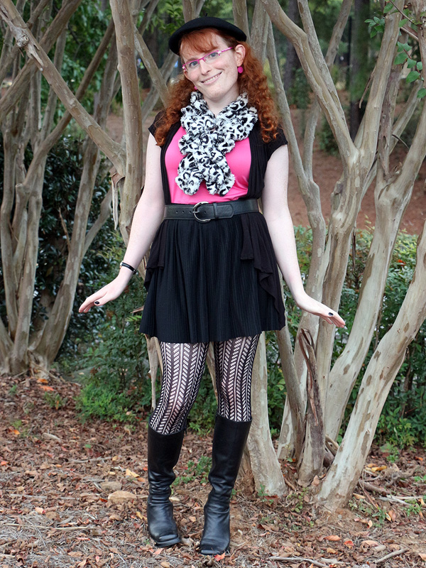 I feel that the neckline of the ruffle front top is a bit lacking, so I wanted to fill it in with a necklace. As you can see from the previous time I wore it on the blog, the necklace has a simple triangular shape. For this occasion, I tucked the edges inside the neckline of my top, then bloused the necklace to make a rounded outline. The effect is not entirely stable, as you can see in the last photo, where the edges have fallen free. But I liked the effect enough that I sewed another piece of black metal mesh into the same folded, rounded shape to make a new necklace.
