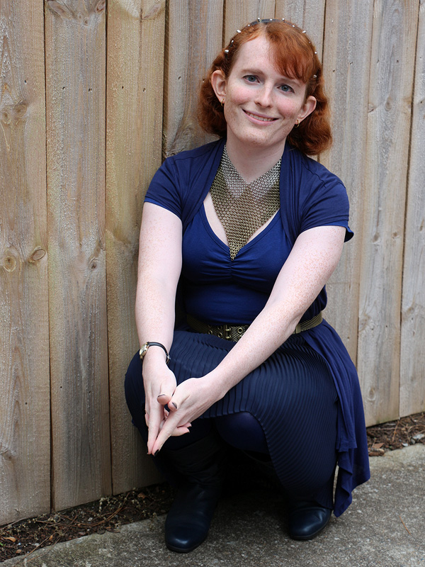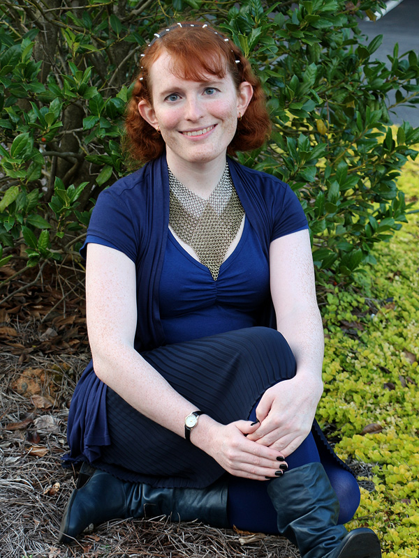 I usually end up wearing most, if not all, of my maille necklace against my skin, as I am here. Much as I love it, including the feel of it against my skin, this can be awkward seasonally, as the metal conducts heat very well, becoming icy in the winter and scalding in the summer.