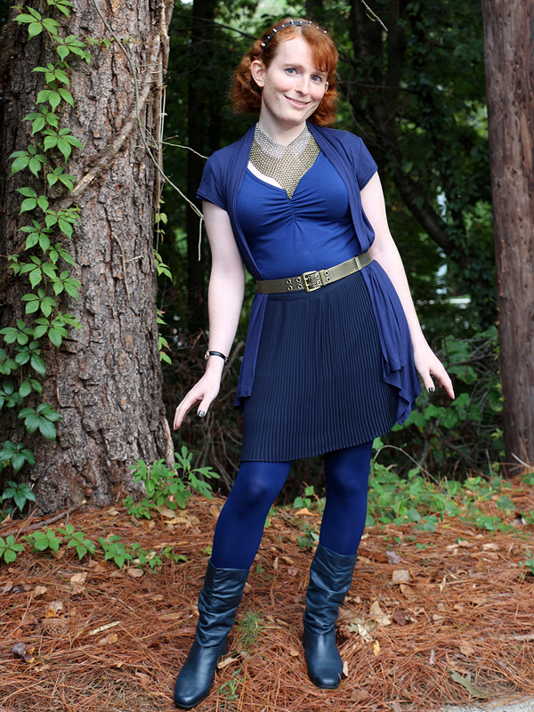 My recent interest in navy and dark blue, expressed here, reaches its natural conclusion in today's head-to-toe navy outfit, relieved mainly by my two favorite bold metallic pieces. My headband, unfortunately, is still black, as I need to buy more parts before I make the navy version of it.