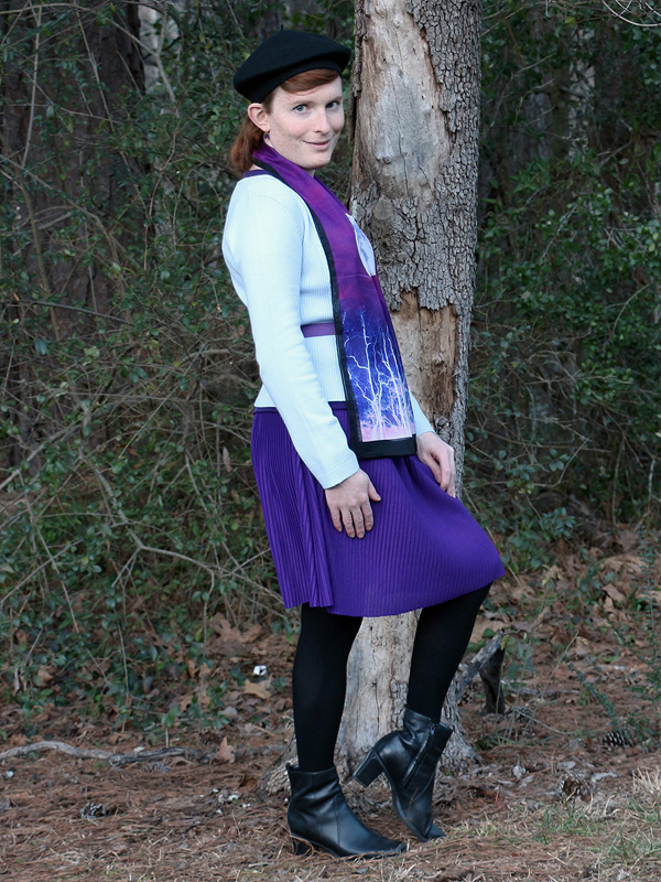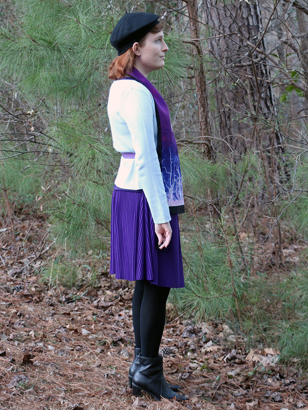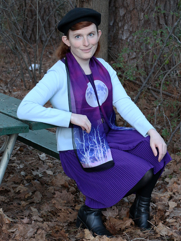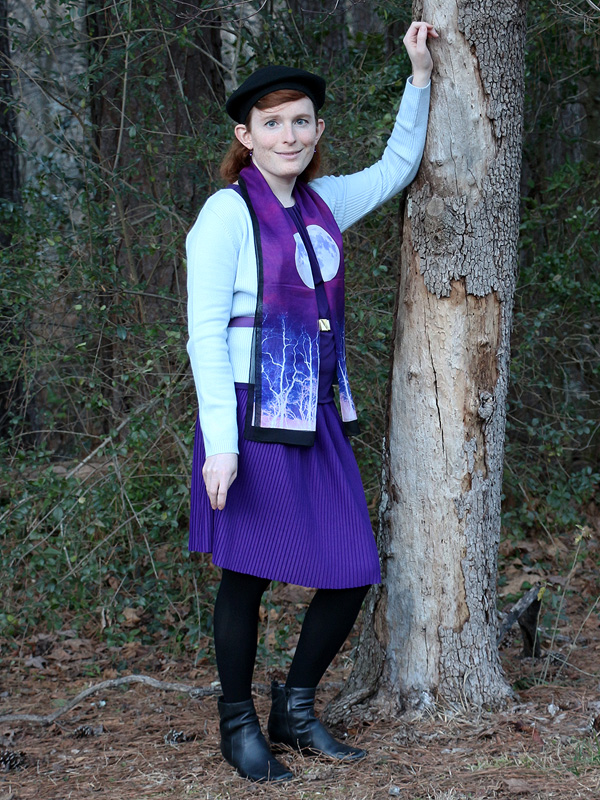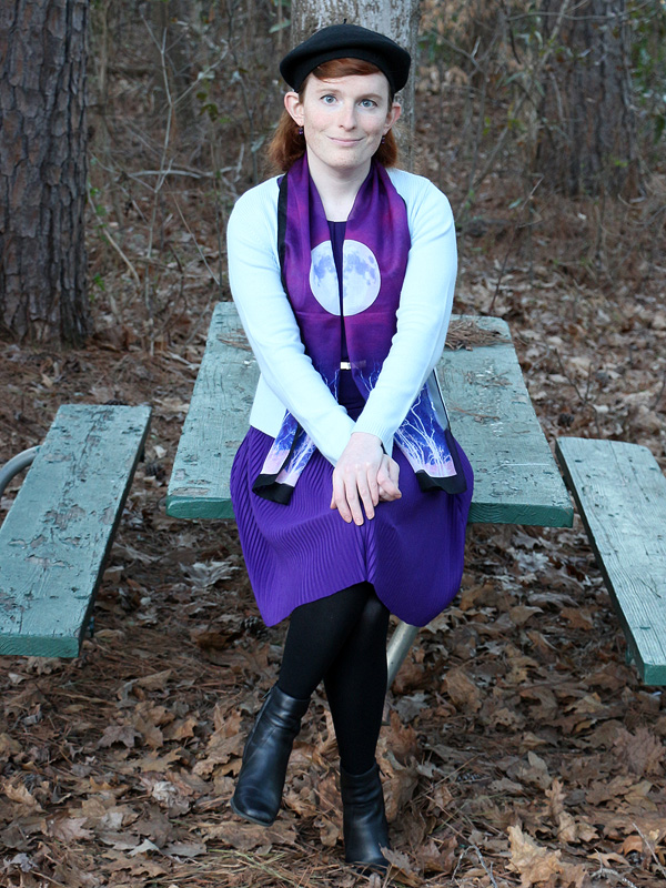 I'm very fond of lunar motifs in jewelry and art, but this scarf is actually the first moon piece in my wardrobe. (The first of many, I expect.) There are two full moons on the scarf, but I think it looks best folded lengthwise so that only half of each is visible. I've worn this outfit, very little changed, quite a few times.