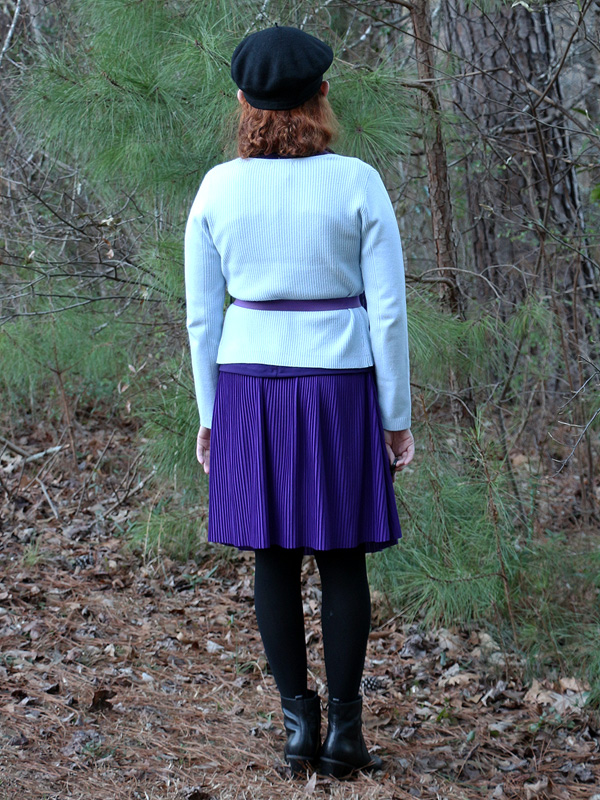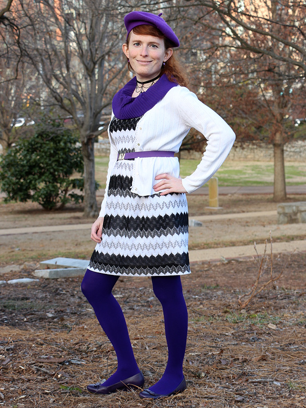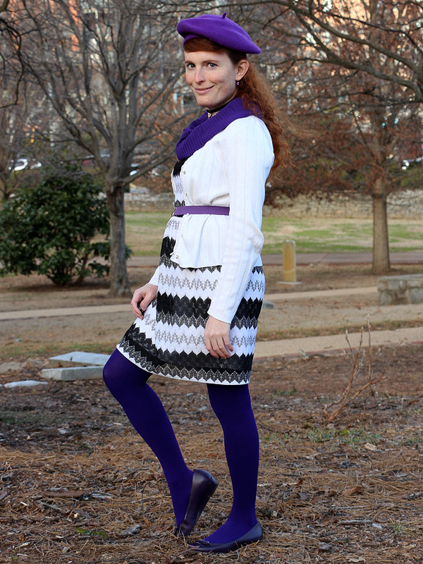 I've worn this scarf, belt, and pair of earrings on the blog a number of times before and even the beret and necklace once each. And now I've added these purple tights and wedges to my wardrobe as well. Be prepared for a lot more purple outfits to come. (Though, as of writing, I've finally picked up a few great green items too!)